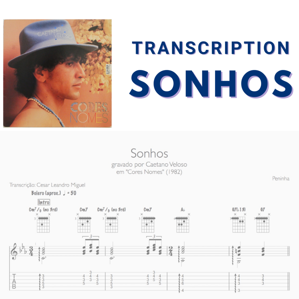 This is a full detailed transcription in both TAB and NOTATION versions. You'll get chord DIAGRAMS, CHORD NAMES and note-by-note how to play this beautiful rendition of the song "Sonhos", composed by Peninha, and played by Caetano Veloso.